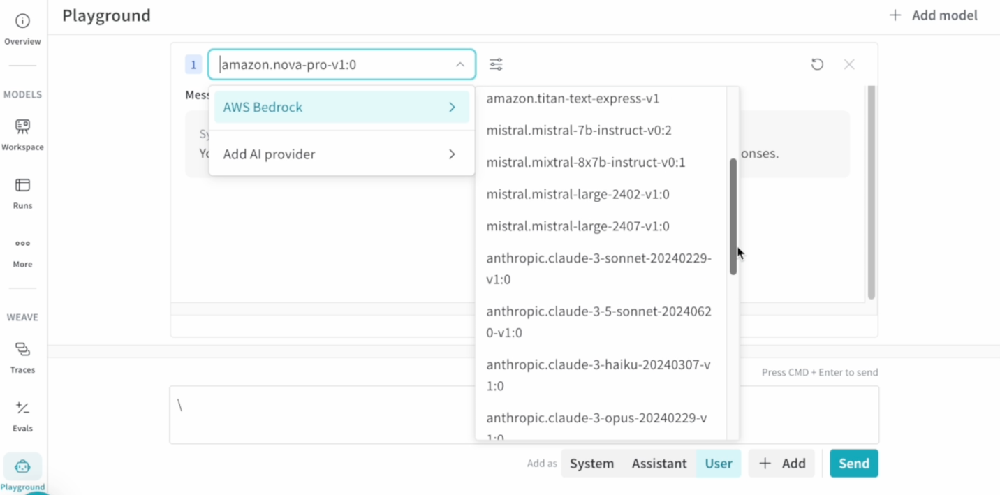 - Experiment with different models in the W&B Weave Playground by adding your AWS credentials and testing various Amazon Bedrock FMs