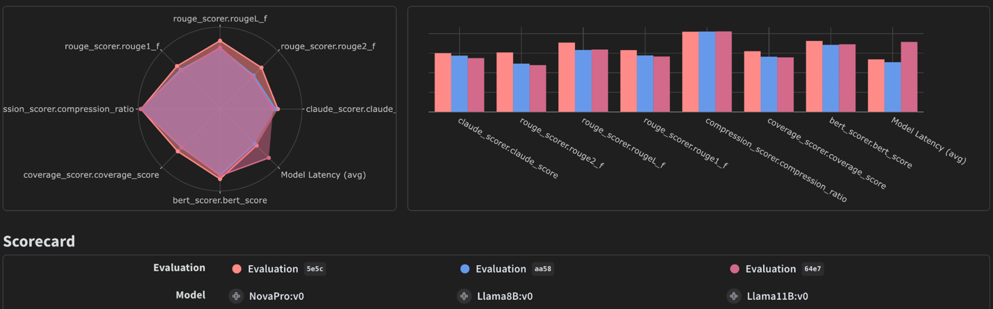 The evaluation dashboard visualizes performance metrics, enabling informed decisions about model selection and configuration. For detailed guidance, see our previous post on evaluating LLM summarization with Amazon Bedrock and Weave.