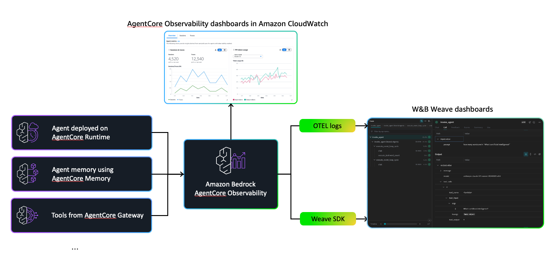 This approach maintains compatibility with AgentCore’s existing OpenTelemetry infrastructure while routing traces to W&B Weave for visualization.When using both AgentCore and W&B Weave together, teams have multiple options for observability. AgentCore’s CloudWatch integration monitors system health, resource utilization, and error rates while providing tracing for agent reasoning and tool selection. W&B Weave offers visualization capabilities that present execution data in formats familiar to teams already using the W&B environment. Both solutions provide visibility into how agents process information and make decisions, allowing organizations to choose the observability approach that best aligns with their existing workflows and preferences.This dual-layer approach means users can: