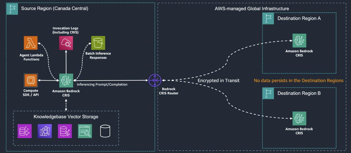 The key distinction is that while inference processing (the transient computation) may occur in another Region, all data at rest—including logs, knowledge bases, and any stored configurations—remains exclusively within the Canada (Central) Region. The inference request travels over the AWS Global Network, never traversing the public internet, and responses are returned encrypted to your application in Canada.