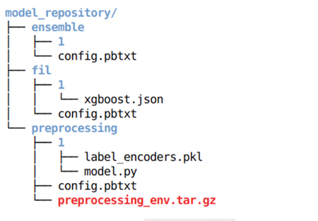 The Python backend in Triton requires us to use a Conda environment as a dependency. In this case, we use the Python backend to preprocess the raw data before feeding it into the XGBoost model being run in the FIL backend. Even though we originally used RAPIDS cuDF and cuML libraries to do the data preprocessing (as referenced earlier using our GPU), here we use Pandas and Scikit-learn as preprocessing dependencies for inference time (using our CPU). We do this for three reasons: