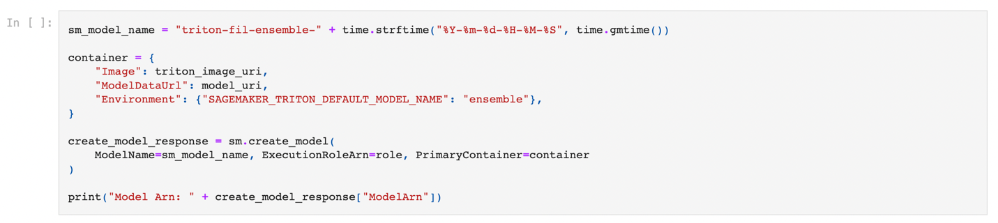 We can now create a SageMaker model from the model repository we uploaded to Amazon S3 in the previous step.