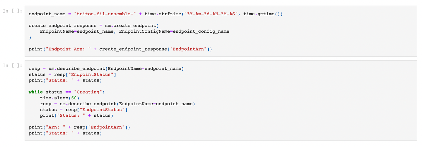 Lastly, we use the preceding endpoint configuration to create a new SageMaker endpoint and wait for the deployment to finish. The status changes to InService after the deployment is successful.
