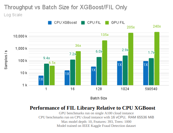 That’s it! Your endpoint is now ready for testing and validation. At this point, you may want to use various tools to help optimize your instance types and configuration to get the best possible performance. The following figure provides an example of the gains that can be achieved by using the FIL backend for an XGBoost model on Triton.