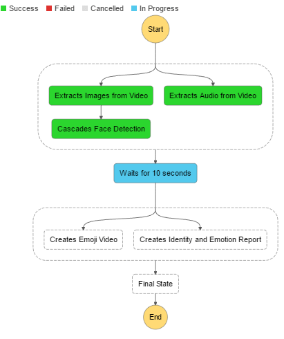 HowWhoFeelInVideo is a serverless application built using AWS Lambda functions. Five of the Lambda functions are included in the HowWhoFeelInVideo state machine. AWS Step Functions streamlines coordinating the components of distributed applications and microservices using visual workflows. This simplifies building and running multi-step applications.