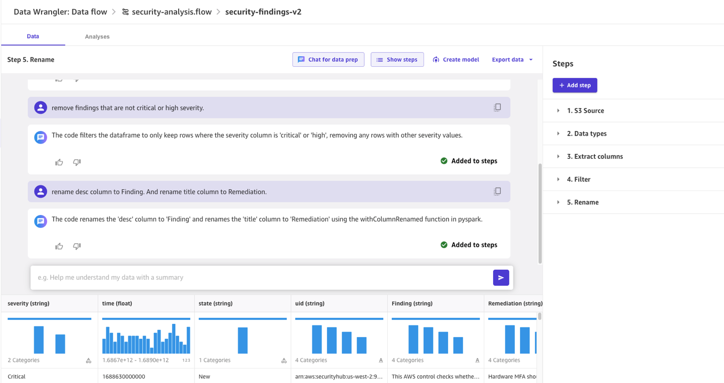 In this post, we demonstrate three key transformations; filtering, column renaming, and text extraction from a column on the security findings dataset. We also demonstrate using the chat for data prep feature in SageMaker Canvas to analyze the data and visualize your findings.