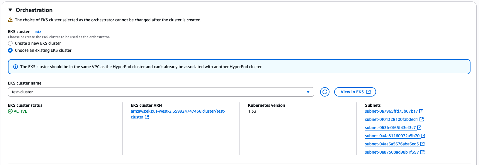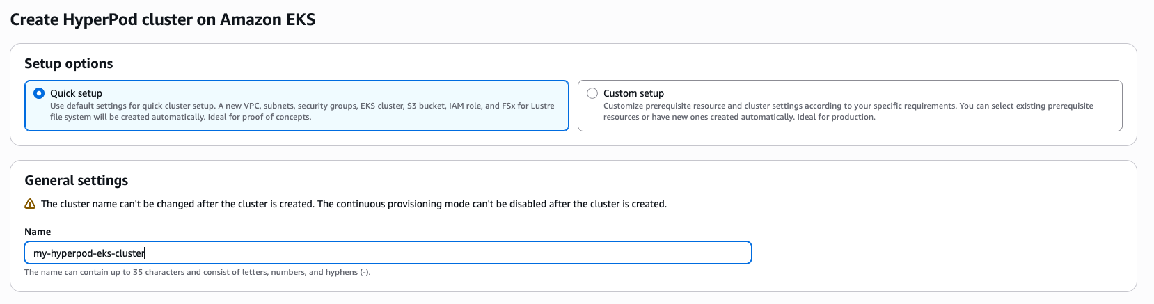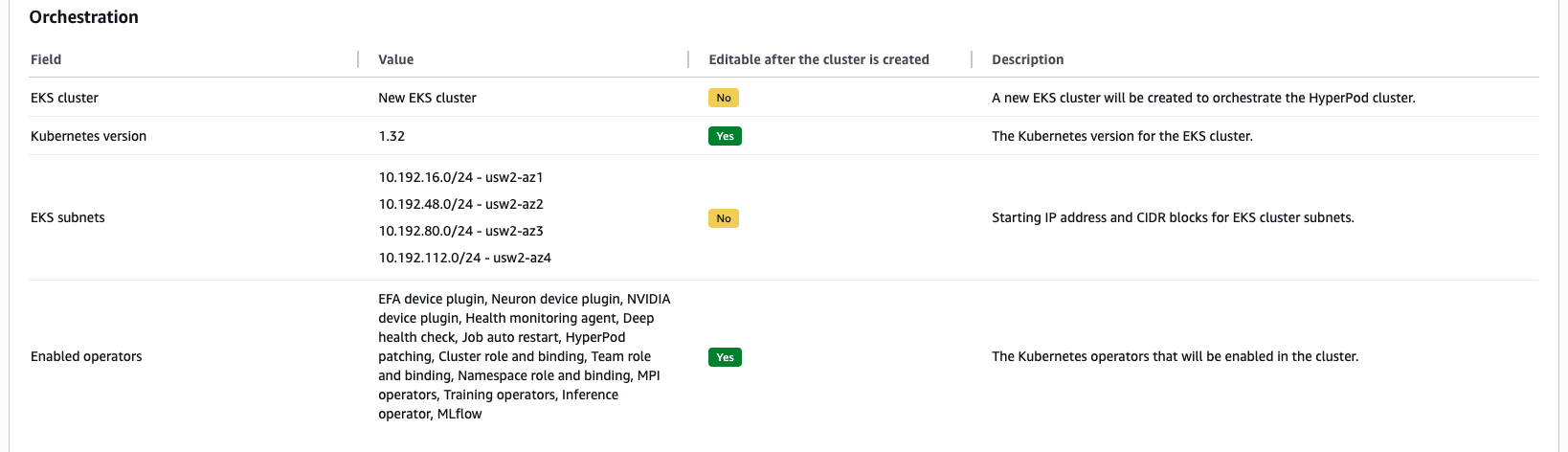For Amazon EKS orchestration, quick setup creates a new EKS cluster using the latest supported Kubernetes version with available operators enabled, including the EFA, Neuron, and NVIDIA device plugins; the health monitoring agent (HMA); the Kubeflow training operators; and the SageMaker HyperPod inference operator.