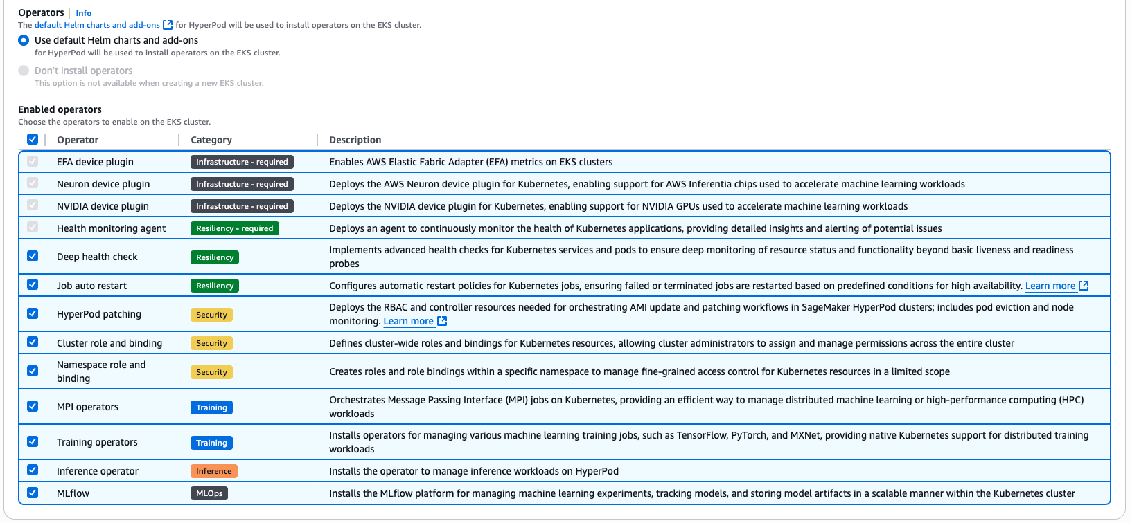 You also have granular control over which optional operators are installed in your EKS cluster using the default Helm charts based on the specific requirements of your workload. Some of these components are required and must be installed for SageMaker HyperPod clusters to operate successfully.