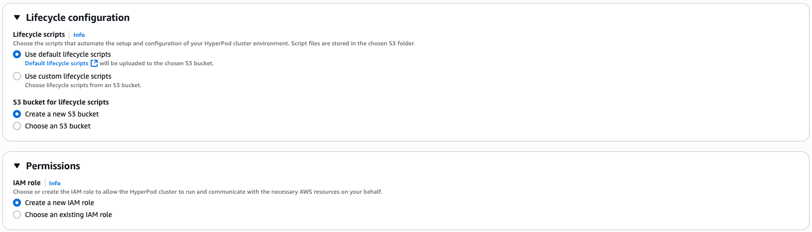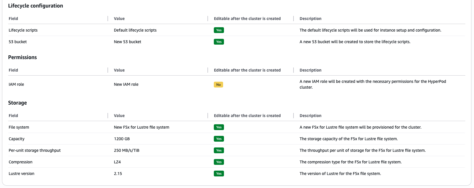 Quick setup also creates a new S3 bucket to store the default lifecycle scripts for instance setup and configuration, a new IAM role with the necessary permissions for the SageMaker HyperPod cluster, and a new FSx for Lustre file system for high-performance data storage and retrieval.