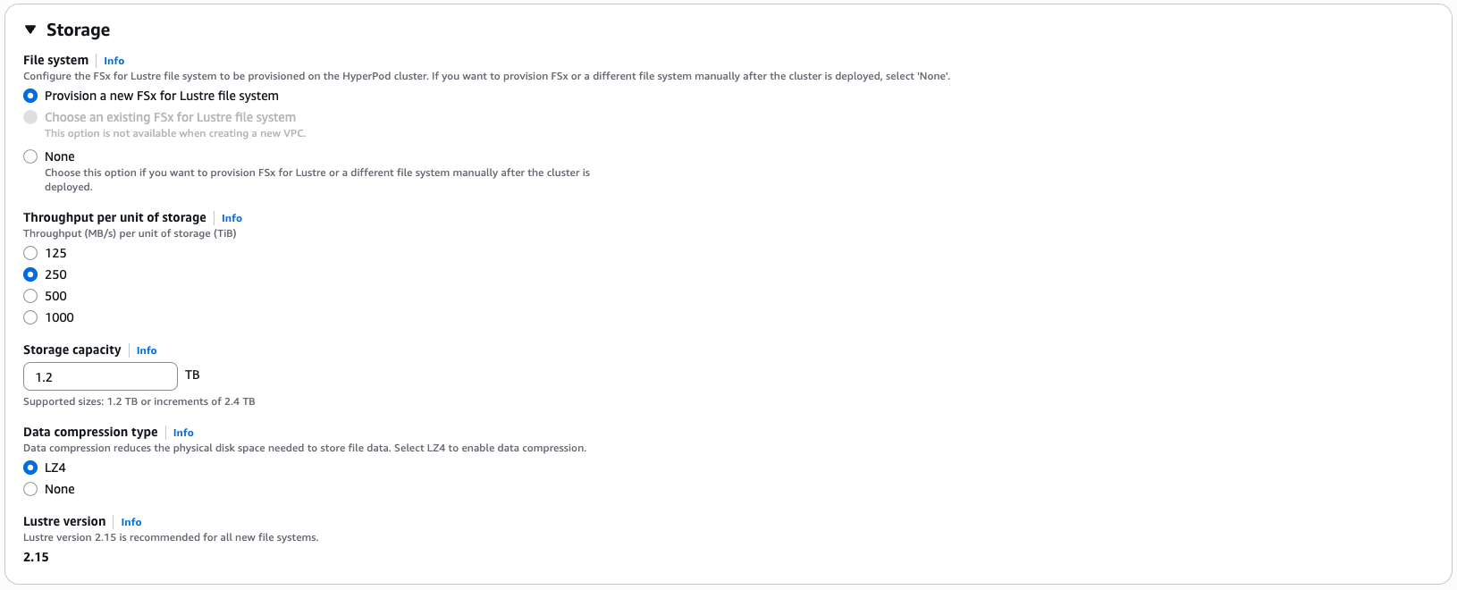 With a custom setup, you can choose to use custom lifecycle scripts from an existing S3 bucket for advanced configuration needs like installing custom machine learning (ML) frameworks or specific versions of dependencies, deploying proprietary software or tools, and configuring specific network optimizations. You can also assign an existing IAM role to the SageMaker HyperPod cluster to accommodate specific permission requirements. For storage, you have the flexibility to integrate an existing FSx for Lustre file system, provision a new file system with multiple throughput and storage capacity options, or skip file system provisioning if it’s not yet needed.