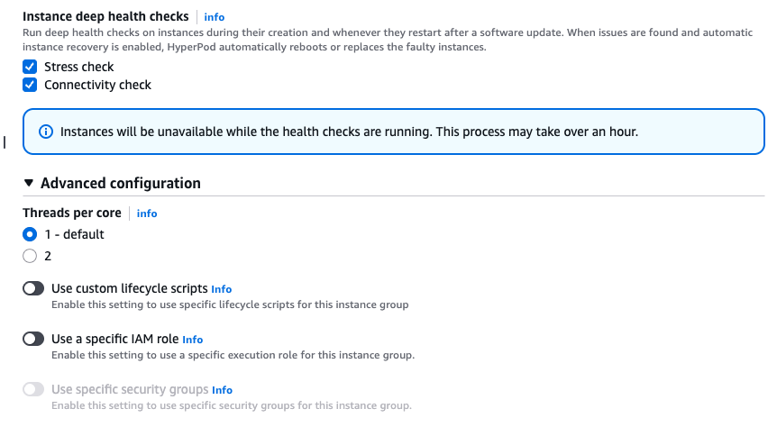With Amazon EKS orchestration, for each instance group that you add, you can enable stress and connectivity deep health checks. These deep health checks are performed in addition to the orchestrator-agnostic basic health checks that also apply to Slurm orchestrated clusters. Stress checks test hardware components under stress to identify potential issues with GPUs, memory, and other hardware components. Connectivity checks test network connectivity between nodes to maintain proper communication for distributed training.