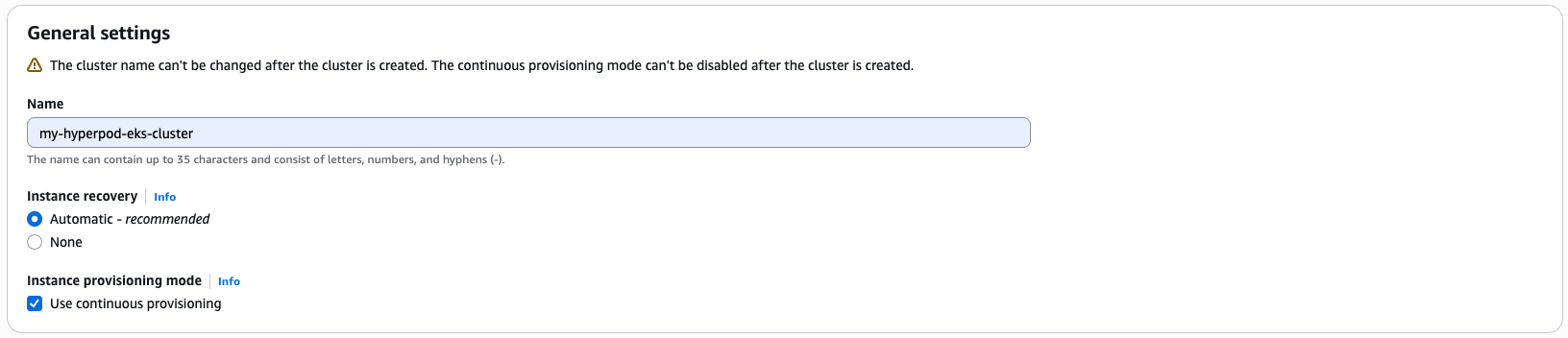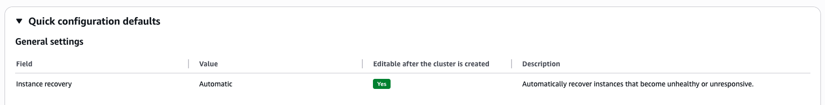 With quick setup, SageMaker HyperPod uses sensible defaults for instance groups, networking, orchestration, lifecycle configuration, permissions, and storage. You can also view which configurations are editable after the cluster is created, and which would require the corresponding AWS resources to be recreated; if you want to edit such configurations, use the custom setup.Quick setup offers automatic instance recovery for instances that become unhealthy or unresponsive.