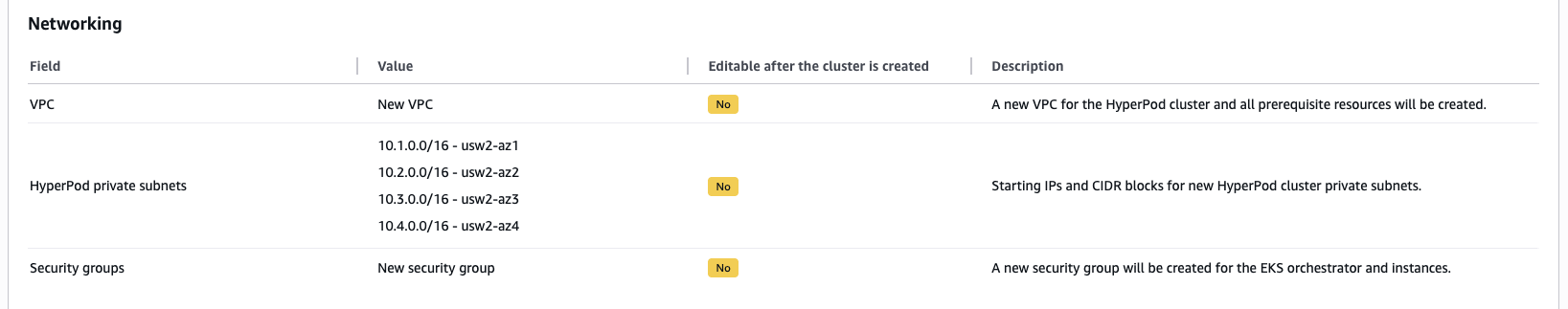 Previously, customers were required to set up a VPC, an Amazon Simple Storage Service (Amazon S3) bucket, AWS Identity and Access Management (IAM) roles, and other AWS resources as prerequisites for creating a SageMaker HyperPod cluster. This multi-step process created manual touch points where misconfiguration could occur.