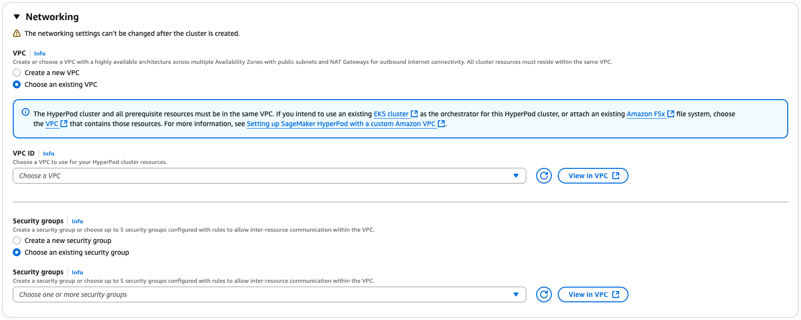 Custom setup gives you the options to create a new VPC with a custom CIDR range and target specific Availability Zones for subnet creation based on the location of your accelerated compute capacity. You can also reference an existing VPC and security group for SageMaker HyperPod cluster deployment, which is useful if you intend to use an existing EKS cluster for orchestration or attach an existing FSx for Lustre file system.