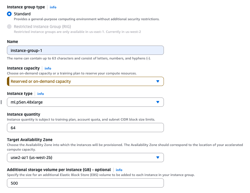 You can choose between standard instance groups, which provide a general-purpose computing environment without additional security restrictions, or restricted instance groups (RIGs) to provision a specialized environment within SageMaker HyperPod that provides an isolated space for training customized Amazon Nova models.