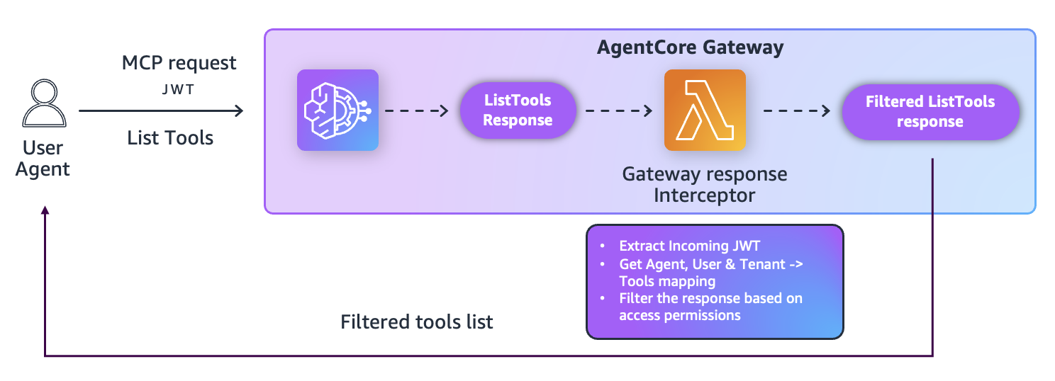 When a target returns a list of tools in response to semantic search or MCP tools/list requests, the gateway response interceptor can be used to enforce fine-grained access control. The interceptor processes the response before it reaches the requesting agent, so users can only discover tools they’re authorized to access. The workflow consists of the following steps: