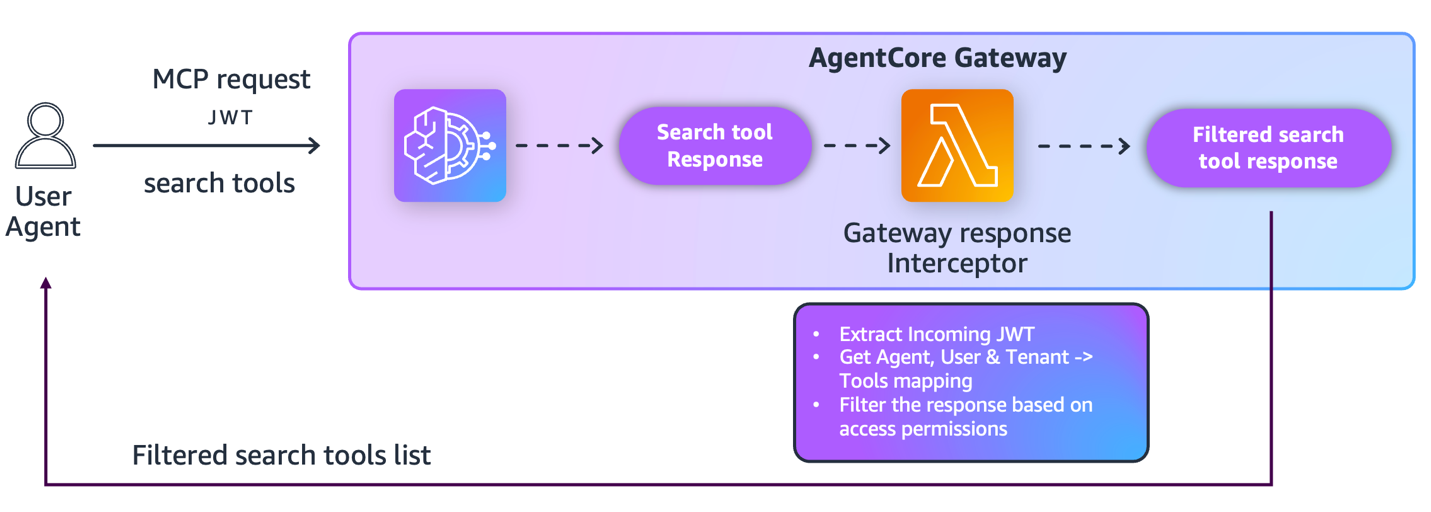 • Gateway response interceptor – The response interceptor Lambda function processes outgoing responses before they return to the calling agent, allowing for audit trail creation, tools filtering, schema translation, and fine-grained access controlling the search and list tools.