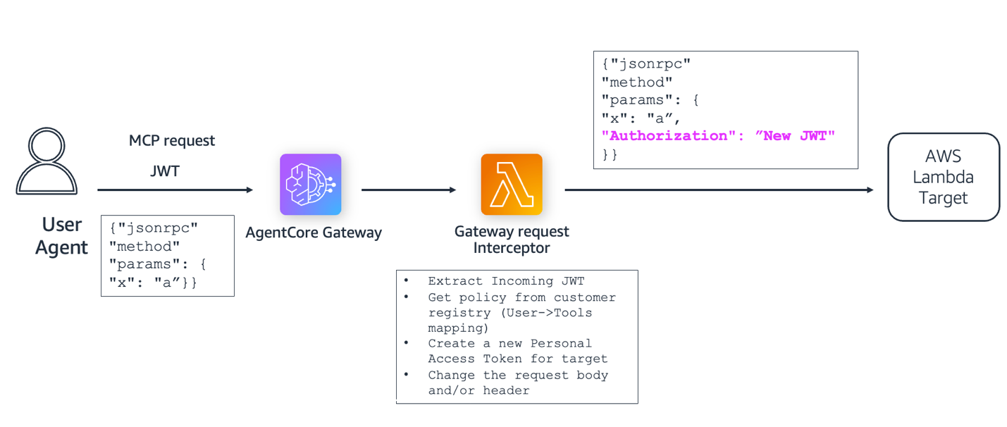 With the launch of gateway interceptors, AgentCore Gateway helps organizations implement fine-grained access control and credential management through custom Lambda functions at two critical points: