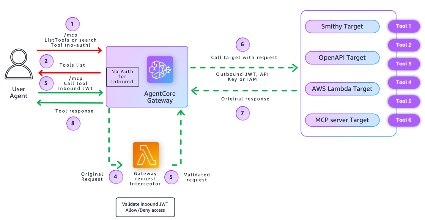 Gateway interceptors work with AgentCore Gateway target types: including Lambda functions, OpenAPI endpoints, and MCP servers.