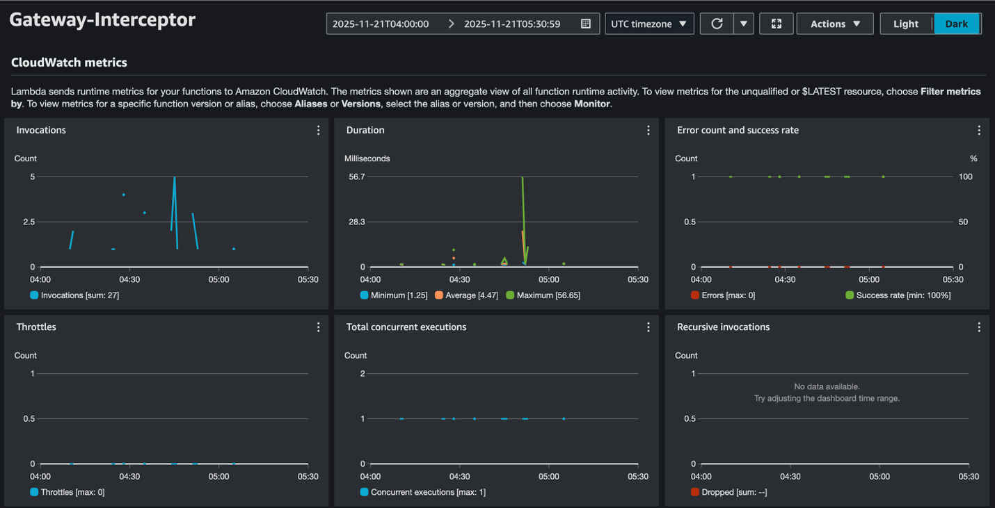 The following screenshot shows sample metrics from Amazon CloudWatch log groups for a gateway interceptor.