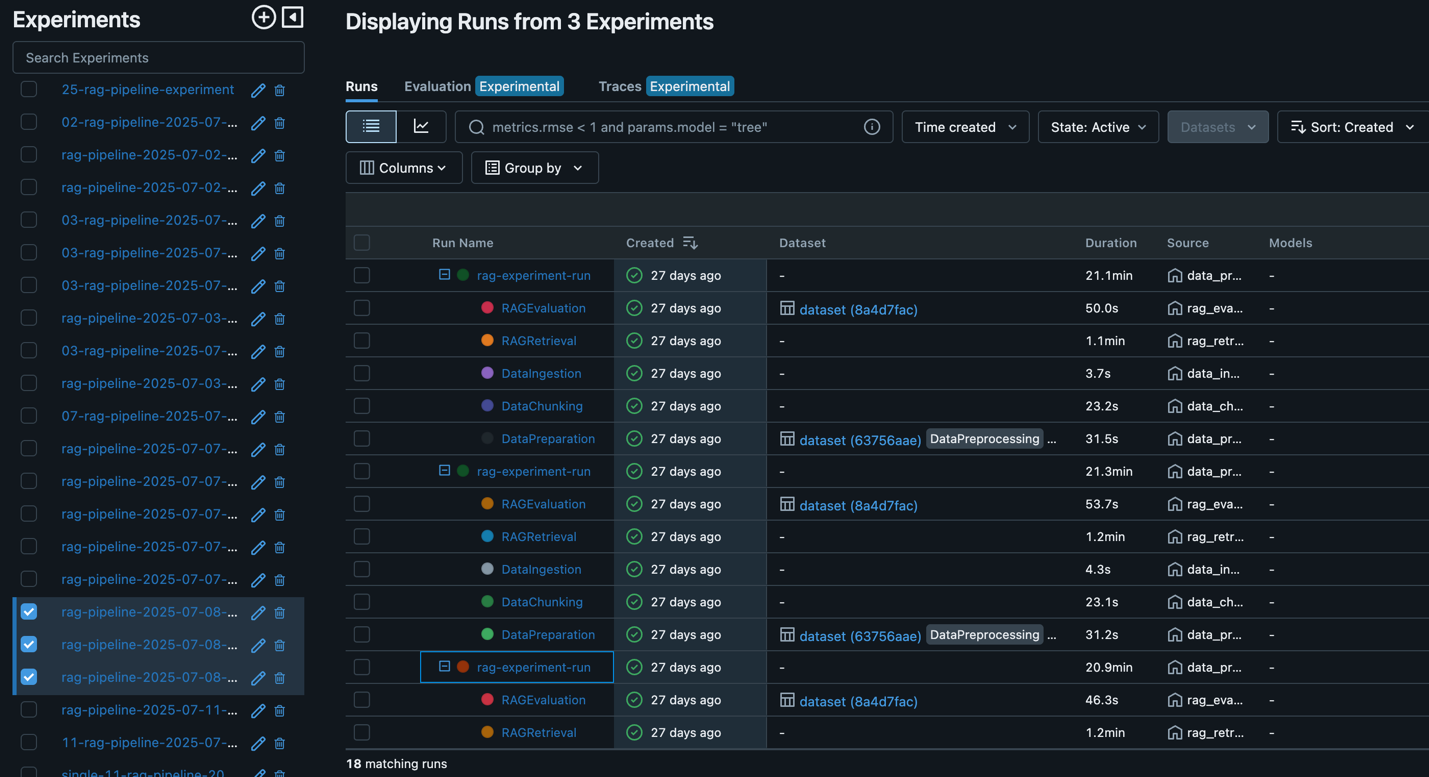 This visualization provides a clear, end-to-end view of the RAG pipeline’s execution, so you can trace the impact of changes at any stage and achieve full reproducibility. The architecture supports scaling to multiple experiments, each representing a distinct configuration or hypothesis (for example, different chunking strategies, embedding models, or retrieval parameters). MLflow’s experiment UI visualizes these experiments side by side, enabling side-by-side comparison and analysis across runs. This structure is especially valuable in enterprise settings, where dozens or even hundreds of experiments might be conducted to optimize RAG performance.