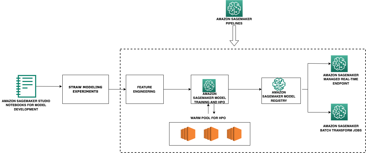 The trained model artifact is registered and versioned in the SageMaker model registry. Inference is run in two ways—real time and batch—based on the user requirements. The trained model artifact is hosted on a SageMaker real-time endpoint using the built-in auto scaling and load balancing features. The model is also scored through batch transform jobs scheduled on a daily basis. The whole pipeline is orchestrated through Amazon SageMaker Pipelines, consisting of a sequence of steps such as a processing step for feature engineering, a tuning step for training and automated model tuning, and a model step for registering the artifact.