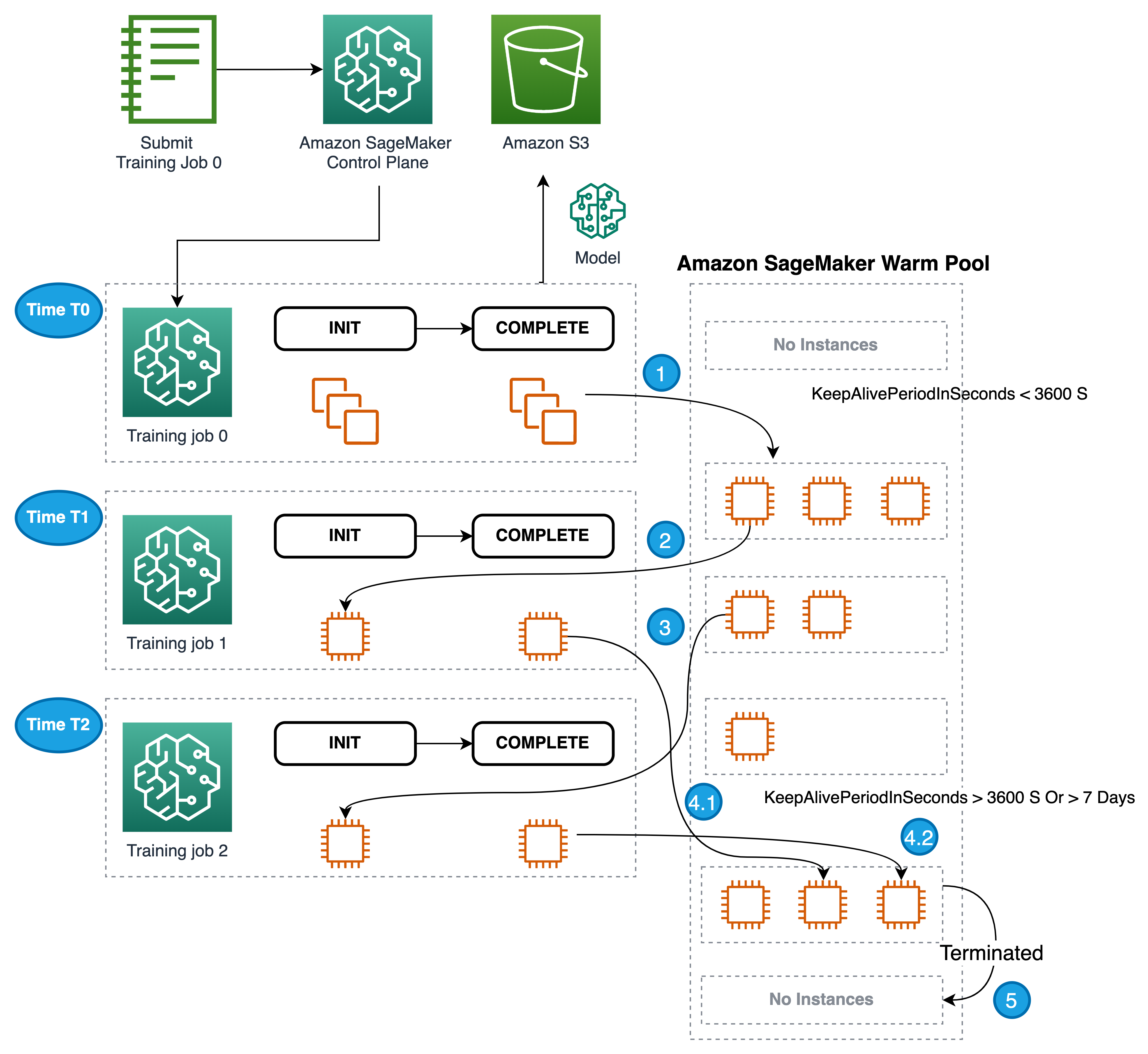 - Once the training job is completed, the instances will be retained in the warm pool waiting for new jobs.
