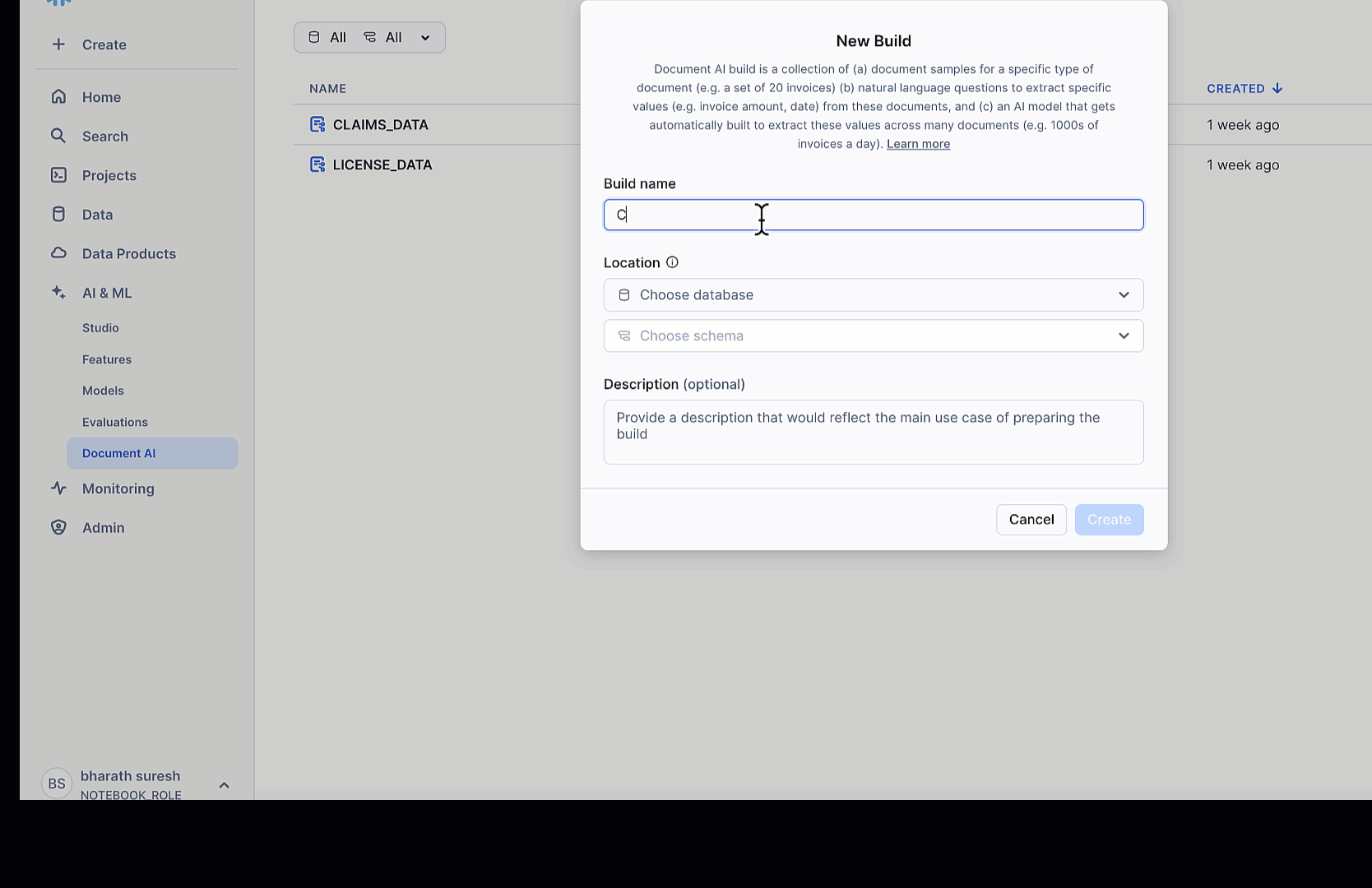 To extract information from unstructured documents such as driver’s licenses and insurance claim forms, we use Snowflake’s Document AI. We’ve created two model builds—LICENSE_DATA and CLAIMS_DATA—each designed to extract specific fields using natural language prompts. After signing into Snowsight with the appropriate role, we choose AI & ML and Document AI in the left navigation pane. Then we create a new build and upload sample documents.