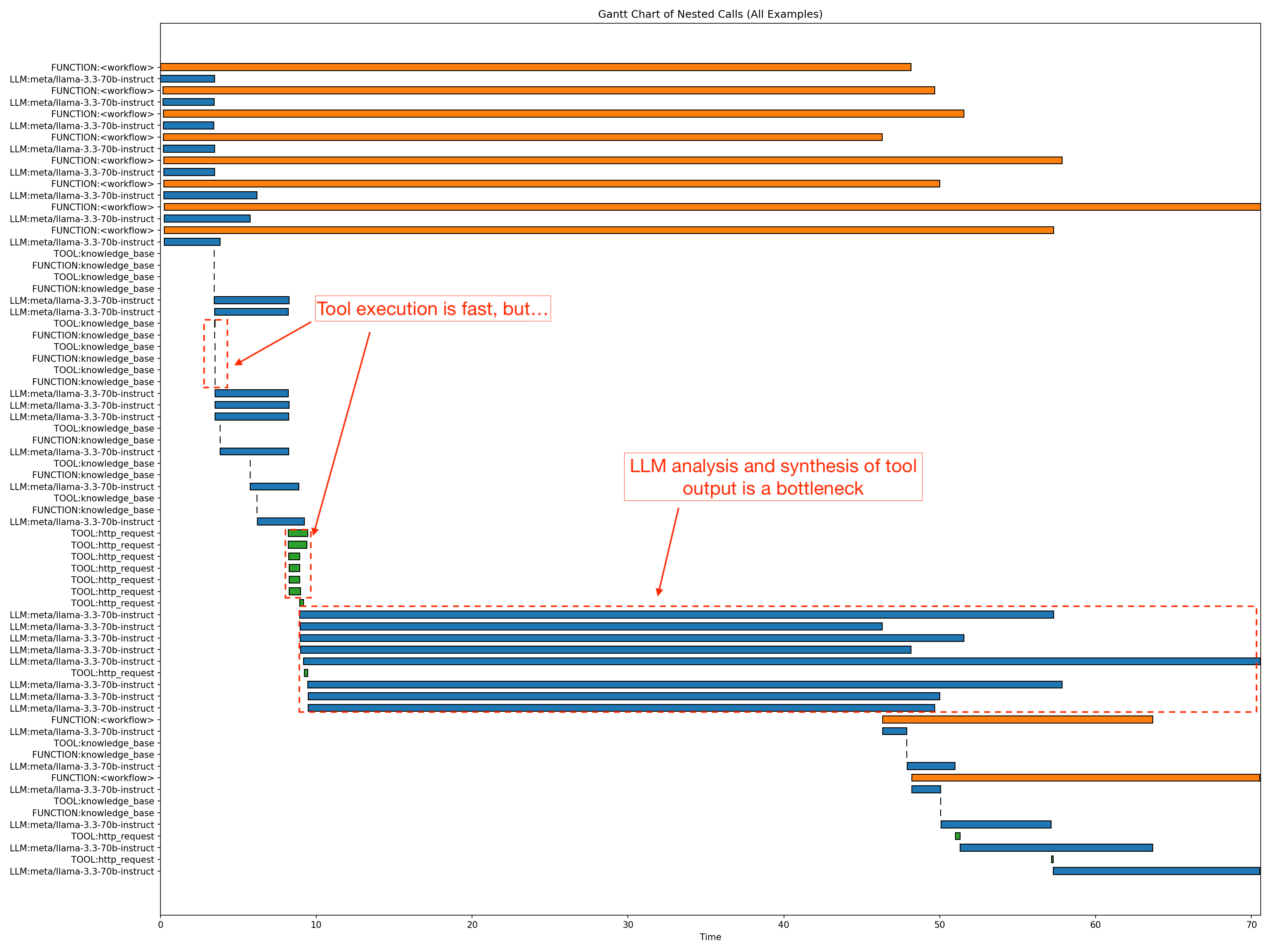 During the profiling, nat spawns eight concurrent agent workflows (shown in orange bars in the chart), which is the default concurrency configuration during evaluation. The p90 latency for the workflow shown is approximately 58.9 seconds. Crucially, the data confirmed that response generation was the primary bottleneck, with the longest LLM segments taking roughly 61.4 seconds. Meanwhile, non-LLM overhead remained minimal. HTTP requests averaged only 0.7–1.2 seconds, and knowledge base access was negligible. Using this level of granularity, you can now identify and optimize specific bottlenecks in the agent workflows.
