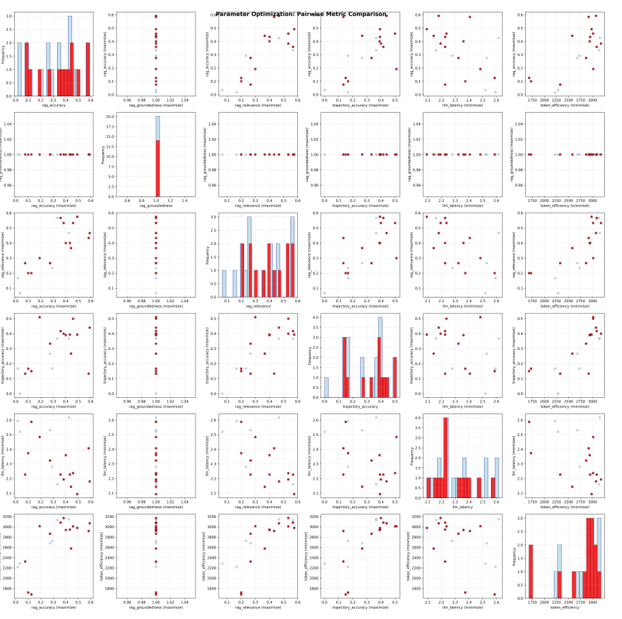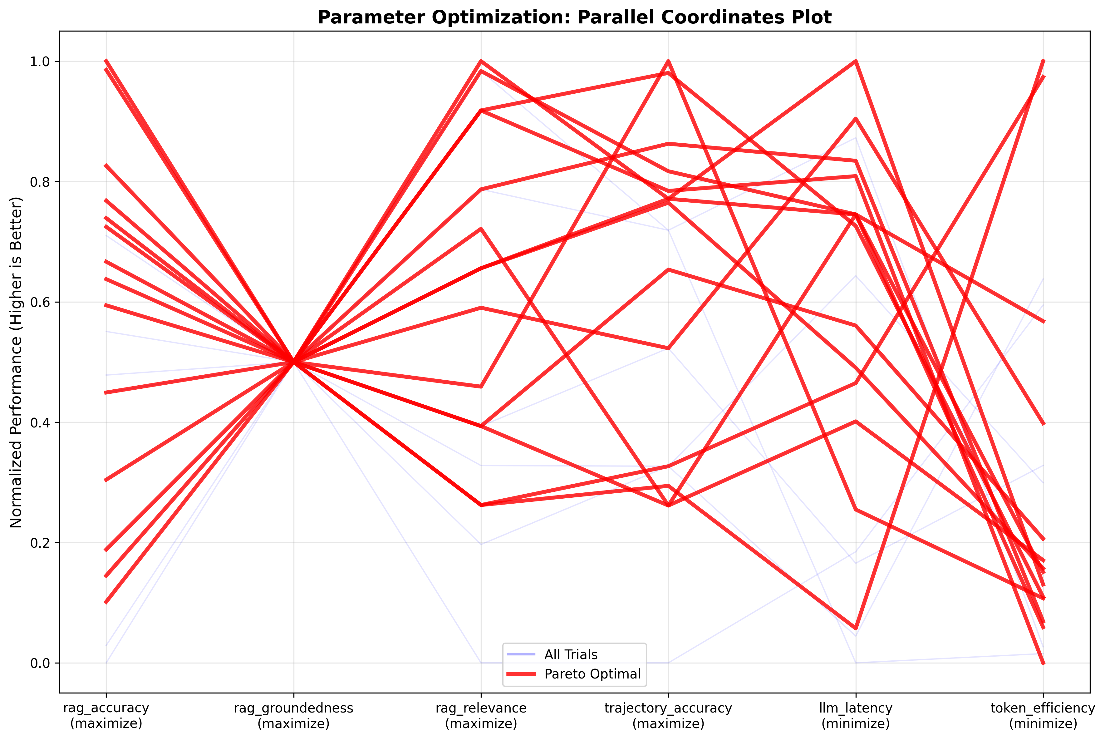 The optimizer plots pairwise pareto curves, as shown in the following pairwise matrix comparison charts, to analyze trade-offs between different parameters. The parallel coordinates plot, that follows the matrix comparison chart, shows optimal trials (red lines) achieving high quality scores (0.8–1.0) across accuracy, groundedness, and relevance while trading off some efficiency as token usage and latency drop to 0.6–0.8 on the normalized scale. The pairwise matrix confirms strong correlations between quality metrics and reveals actual token consumption clustered tightly around 2,500–3,100 tokens across all trials. These results indicate that further gains in accuracy and token efficiency might be possible through prompt engineering. This is something that development teams can achieve using NeMo Agent Toolkit’s prompt optimization capabilities, helping reduce costs while maximizing performance.