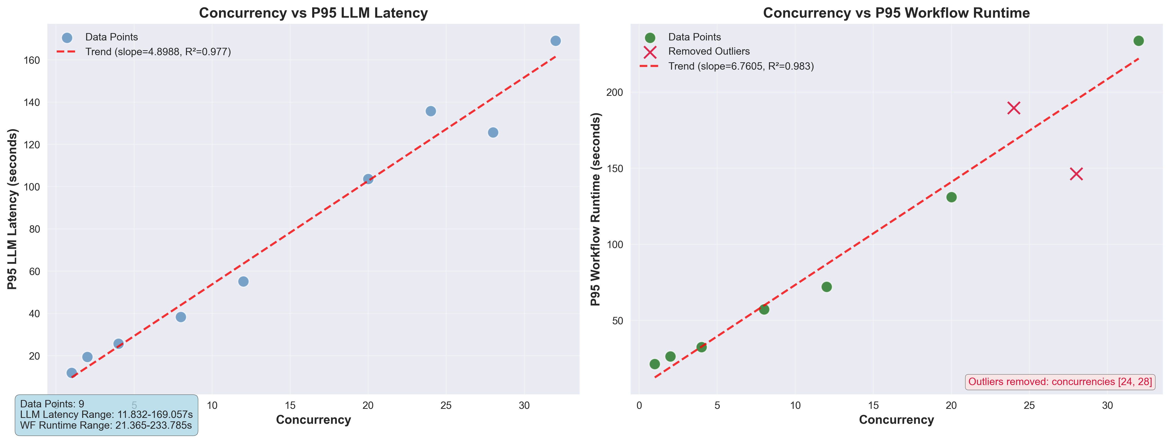 As shown in the following chart, calculated concurrency scales almost linearly with both latency and end‑to‑end runtime, with P95 LLM latency and workflow runtime demonstrating near-perfect trend fits (R² ≈ 0.977/0.983). Each additional concurrent request introduces a predictable latency penalty, suggesting the system operates within a linear capacity zone where throughput can be optimized by adjusting latency tolerance.