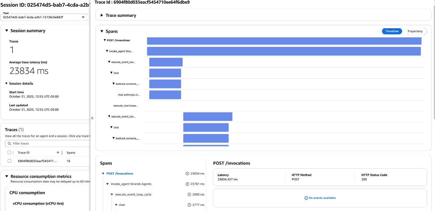 After evaluating, profiling, and optimizing your agent, deploy it to production. Although running the agent locally is sufficient for testing, enterprise deployment requires an agent runtime that helps provide security, scalability, and robust memory management without the overhead of managing infrastructure. This is where Amazon Bedrock AgentCore Runtime shines—providing enterprise-grade serverless agent runtime without the infrastructure overhead. Refer to the step-by-step deployment guide in the NeMo Agent Toolkit Repository. By packaging your optimized agent in a container and deploying it to the serverless Bedrock AgentCore Runtime, you elevate your prototype agent to a resilient application for long-running tasks and concurrent user requests. After you deploy the agent, visibility becomes critical. This integration creates a unified observability experience, transforming opaque black-box execution into deep visibility. You gain exact traces, spans, and latency breakdowns for every interaction in production, integrated into Bedrock AgentCore Observability using OpenTelemetry.