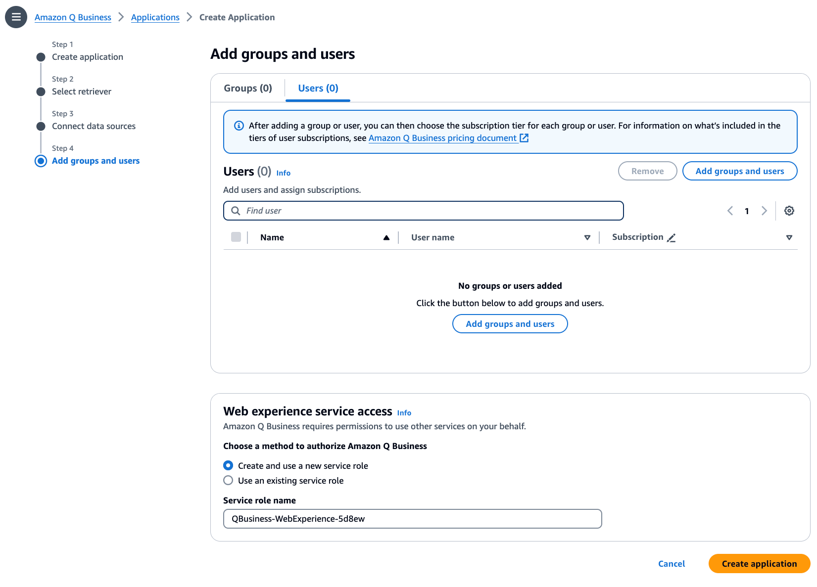 - After choosing subscription for all the users, your screen will look as below. Unless you want to change the service role, choose Create application.