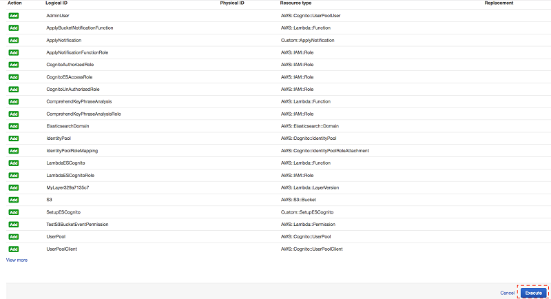 5. Wait a few seconds for the change set to finish computing changes. Your screen should look as follows with Action, Logical Id, Physical Id, Resource Type, and Replacement. Finally, click on the Execute button, which will let AWS CloudFormation launch resources in the background.