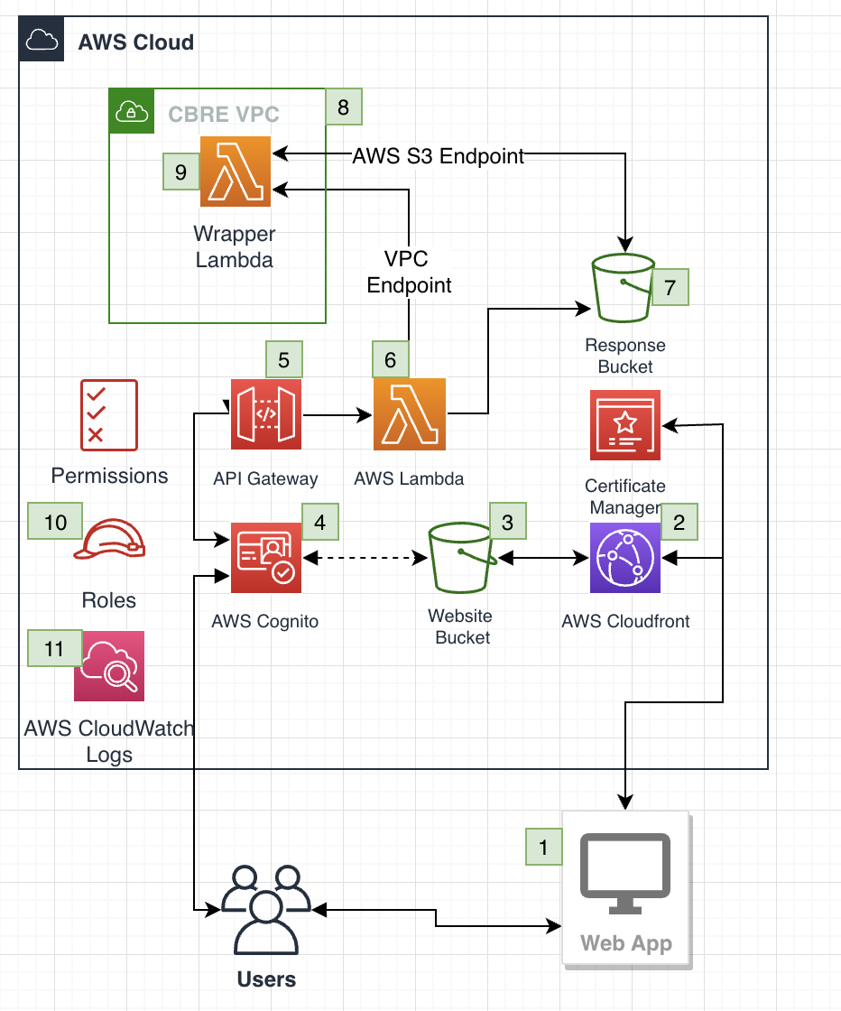 AWS Prototyping built a web interface and API management layer to enable user testing during development and accelerate integration into CBRE’s existing BI capabilities. The following diagram illustrates the web interface and API management layer.