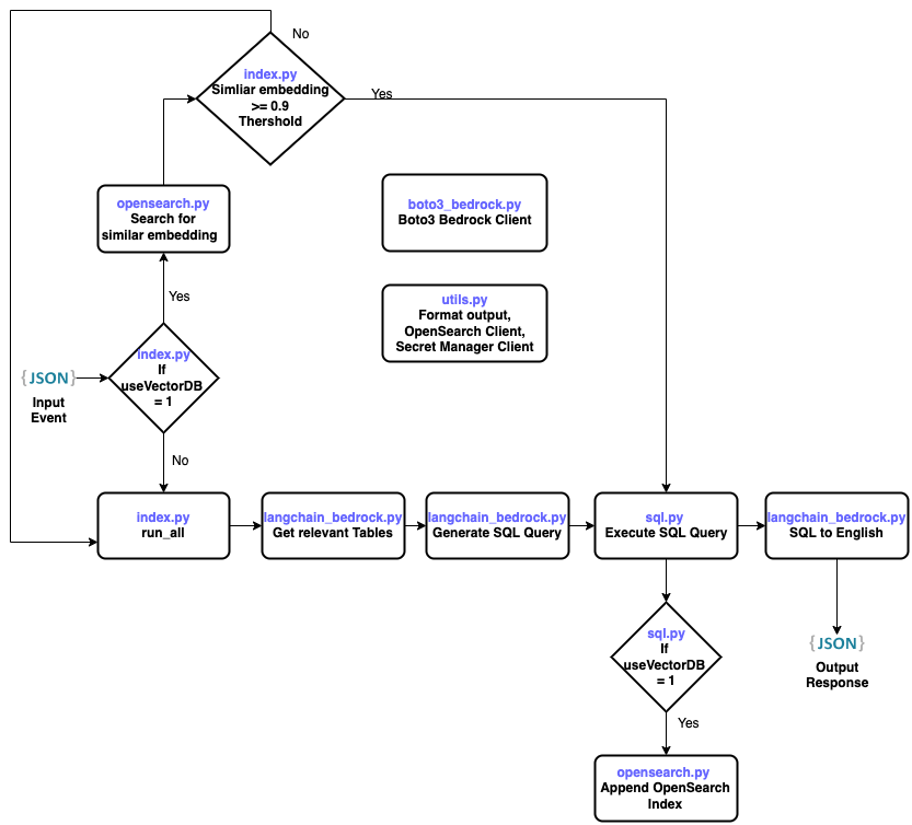- langchain_bedrock.py – Get relevant tables, generate SQL queries, and convert SQL to English using Anthropic Claude 2