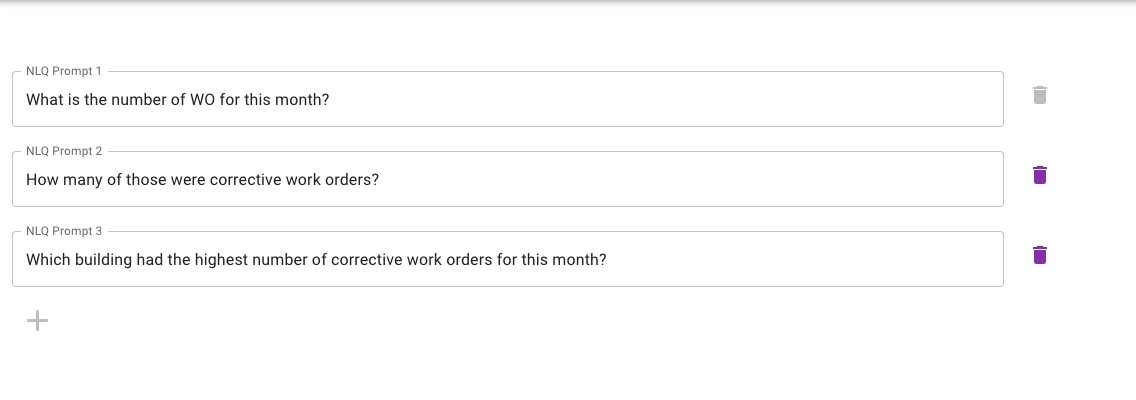 The home page has three sections to it. The first section is the NLQ prompt section, where you can add up to three user prompts and delete prompts as needed.
