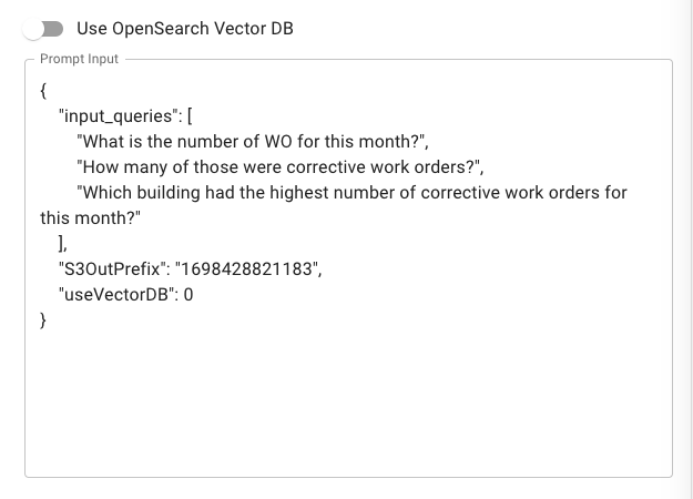 The prompts are then translated into a prompt input that will be sent to the Lambda wrapper function. This section is non-editable and only for reference. You can opt to use the OpenSearch Service vector DB store to get preprocessed queries for faster responses. Only prompts that were processed earlier and stored in the vector DB will return a valid response. For newer queries, we recommend leaving the switch in its default off position.