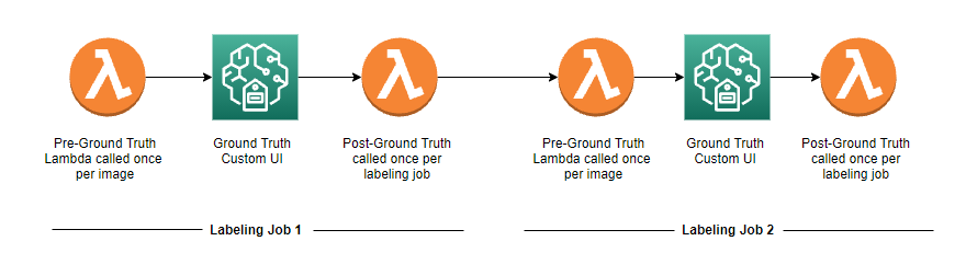 Figure 5: Architecture diagram showing two chained Ground Truth jobs, each with a Pre- and Post- UI Lambda function