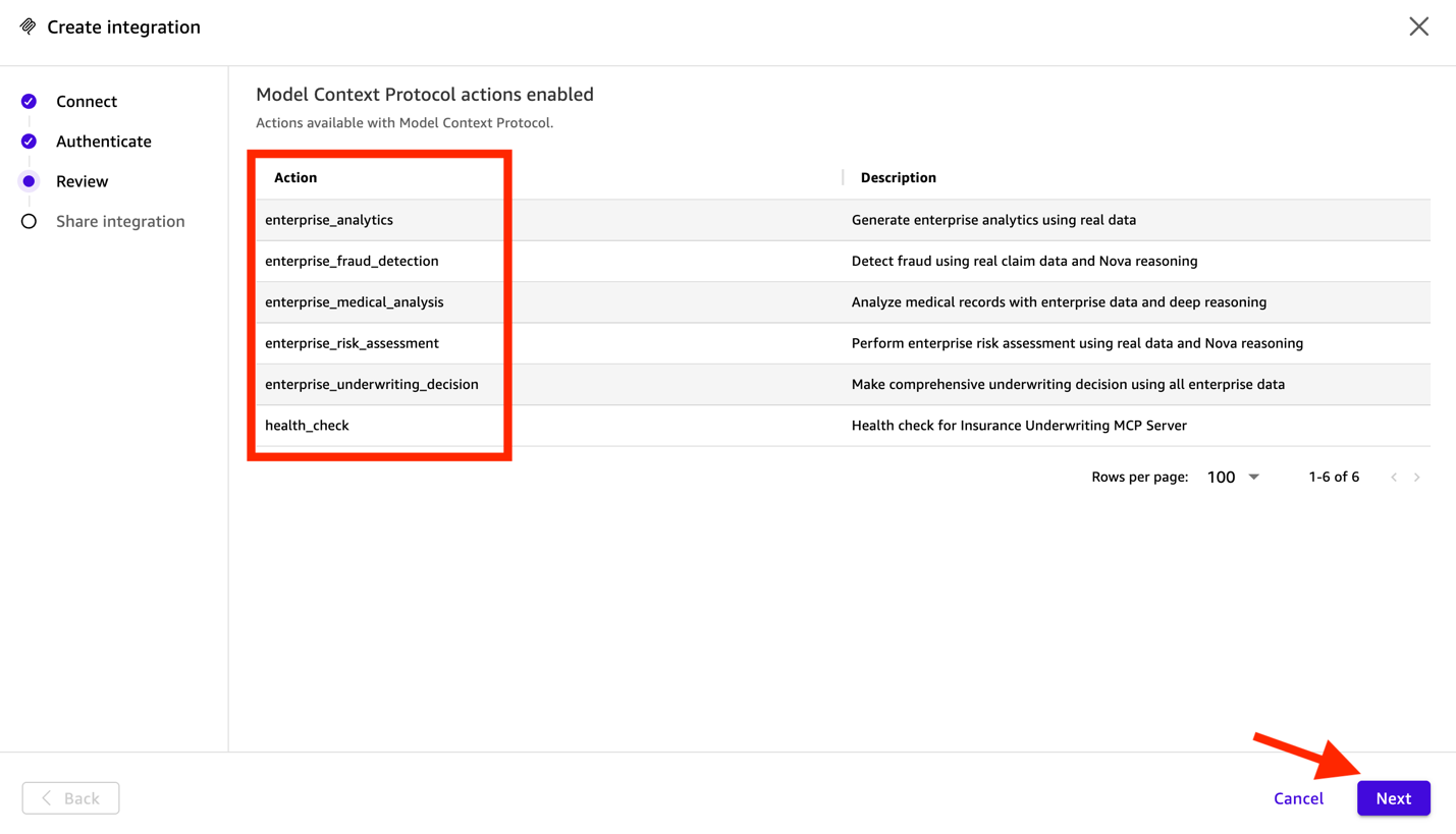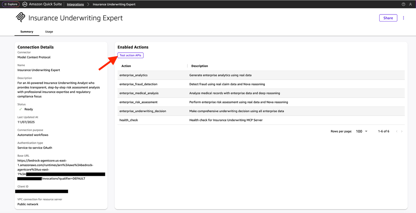 - The chat agent is integrated with Amazon Quick Suite MCP Actions Integrations to invoke actions on an MCP server deployed in AgentCore Runtime. The agent analyzes the prompt to understand the intent and identifies key entities (such as applicant IDs and claim numbers), and decides which MCP tools to invoke.