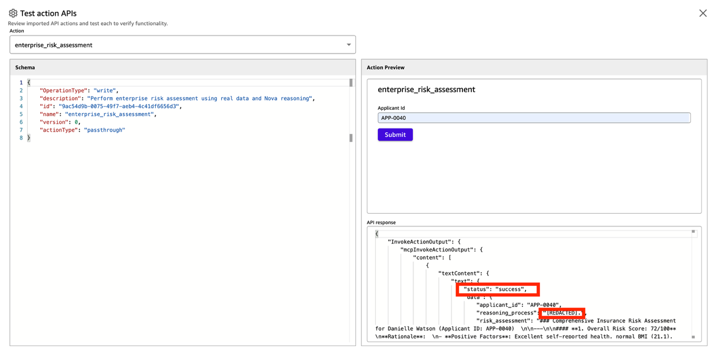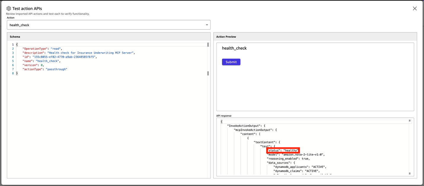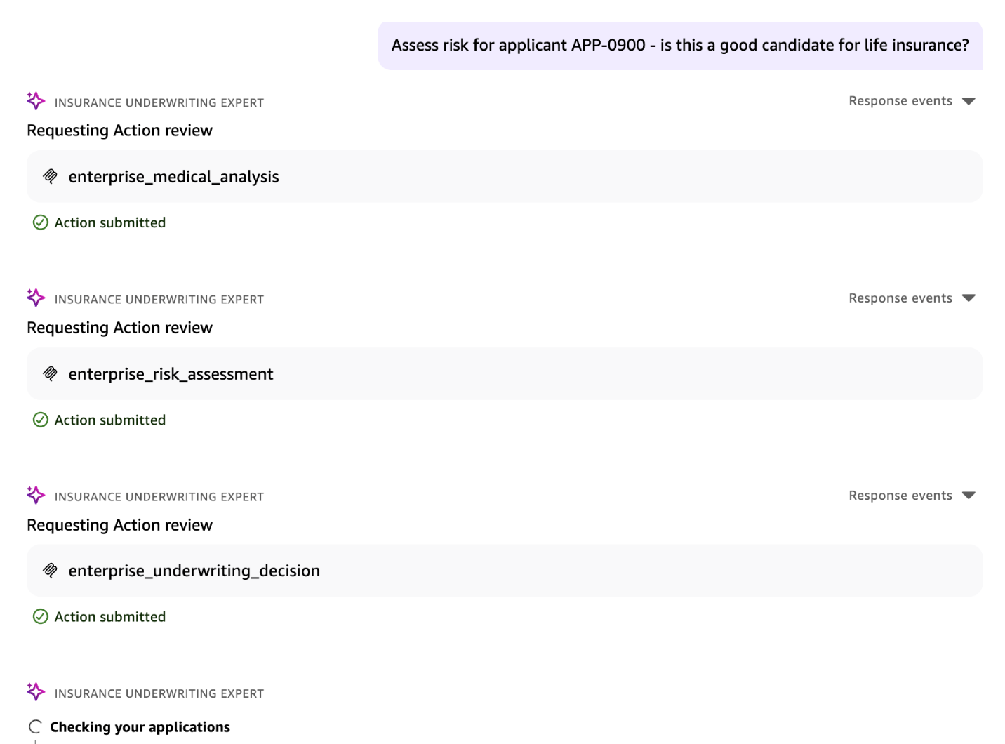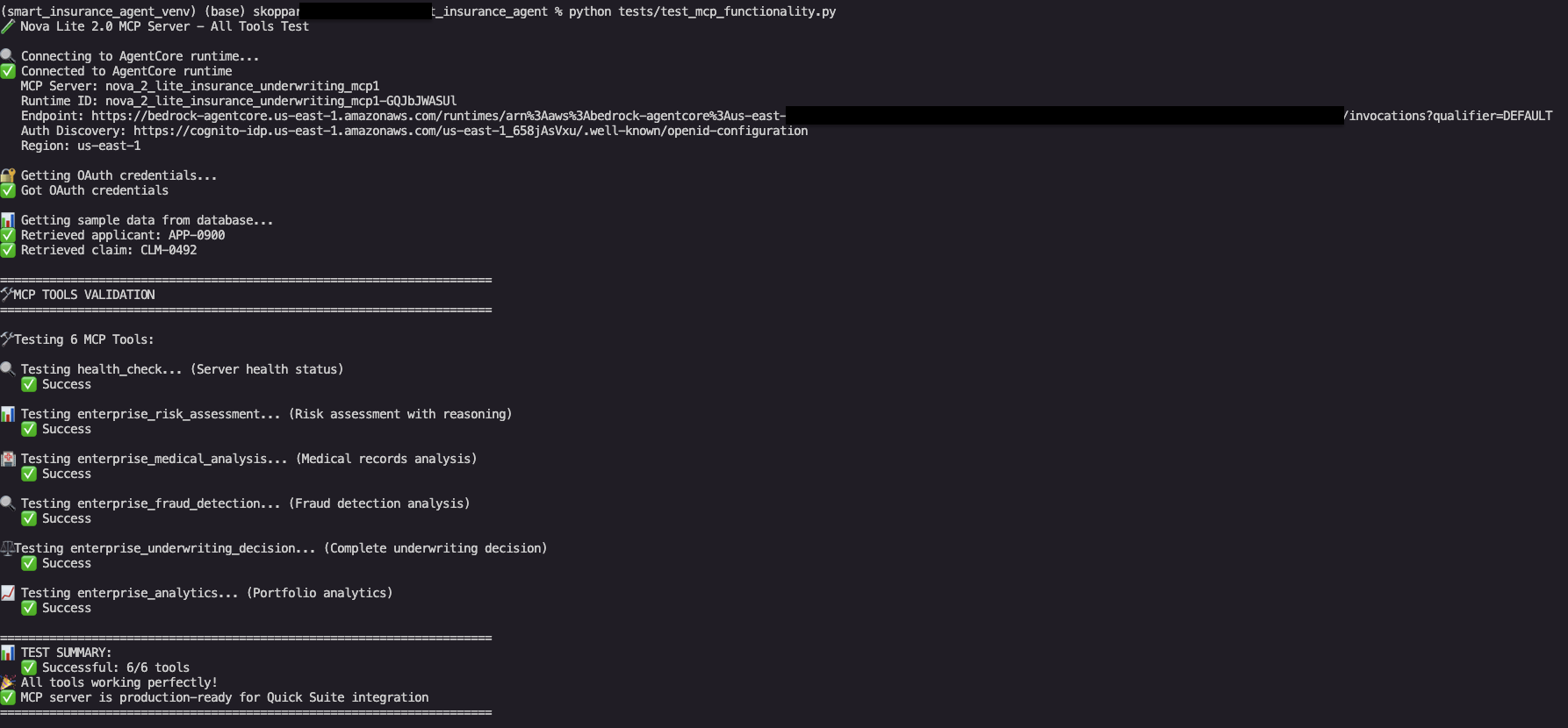 This solution addresses three core underwriting challenges: data scattered across systems, regulatory requirements for explainable decisions, and the need to detect fraud across portfolios. We built this solution by combining three key components: Amazon Nova 2 Lite to generate transparent step-by-step reasoning for every underwriting decision, Amazon Bedrock AgentCore to provide managed MCP server infrastructure with OAuth 2.0 authentication and automatic scaling, and Quick Suite to deliver natural language queries with multi-turn conversation context. The architecture unifies data from DynamoDB and Amazon S3, processes requests through stateless components for horizontal scaling, and maintains complete audit trails in CloudWatch for regulatory compliance. With this solution, underwriters can ask questions like “Assess risk for applicant APP-0900” and get detailed analysis immediately. Investigators can query “Show me all claims filed within 30 days of policy inception” to identify potential untrustworthy activities. Business leaders can gain real-time portfolio intelligence through natural language interactions.