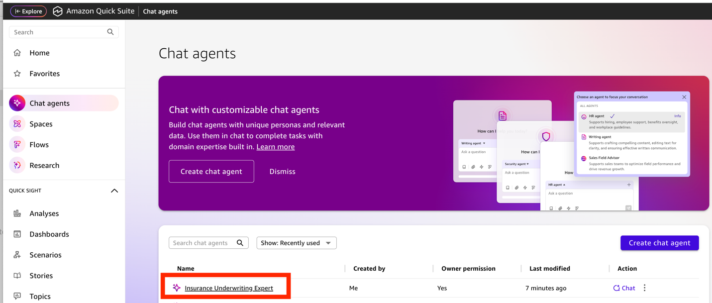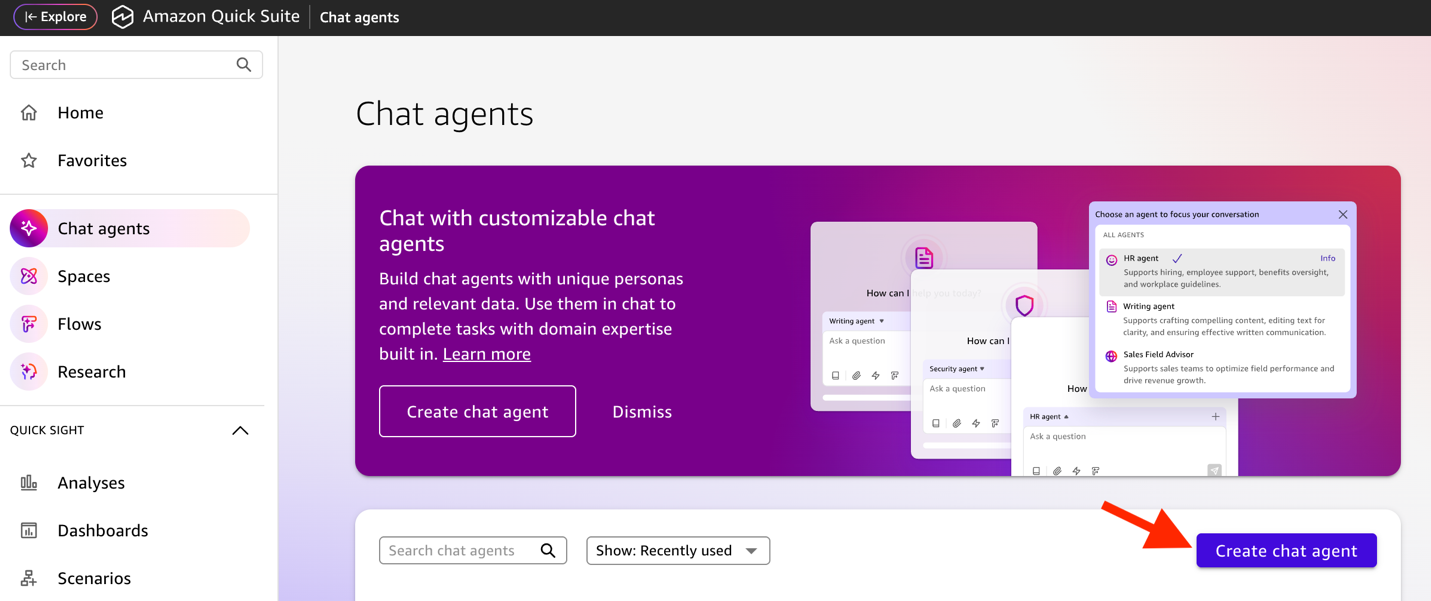 - On the Quick Suite console, choose Chat agents in the navigation pane.