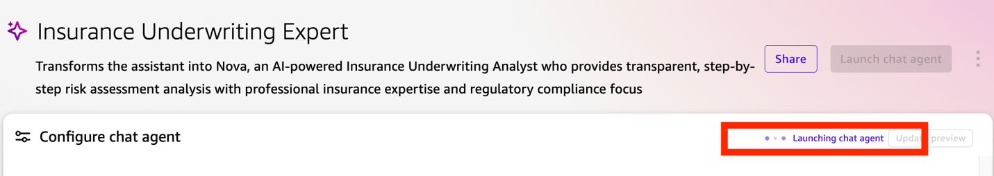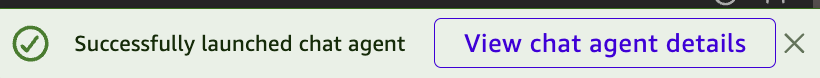 - Choose Launch chat agent to create your custom chat agent. You will see the progress Launching chat agent… and in a few minutes, you will see Successfully launched chat agent.