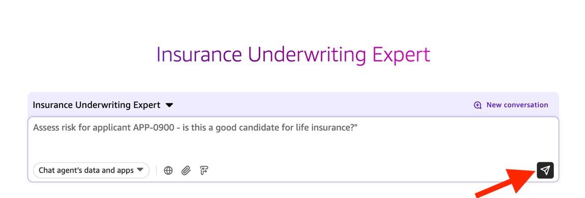 You can now chat with the agent for your specific use cases. The following screenshots show an example. Start by asking the chat agent for a specific risk assessment and choose the send icon.