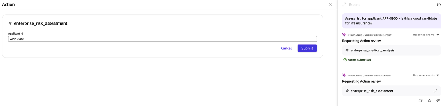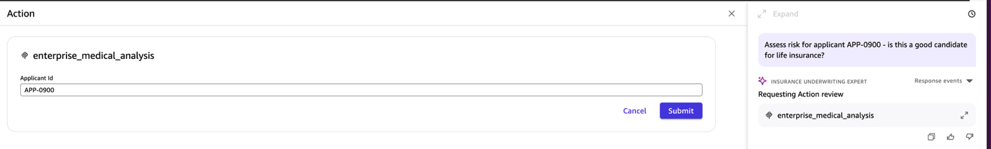 - An authenticated Quick Suite user accesses the Quick Suite chat agent and submits a prompt through the assistant chat interface. For example, “Access the risk for applicant APP-0900.”