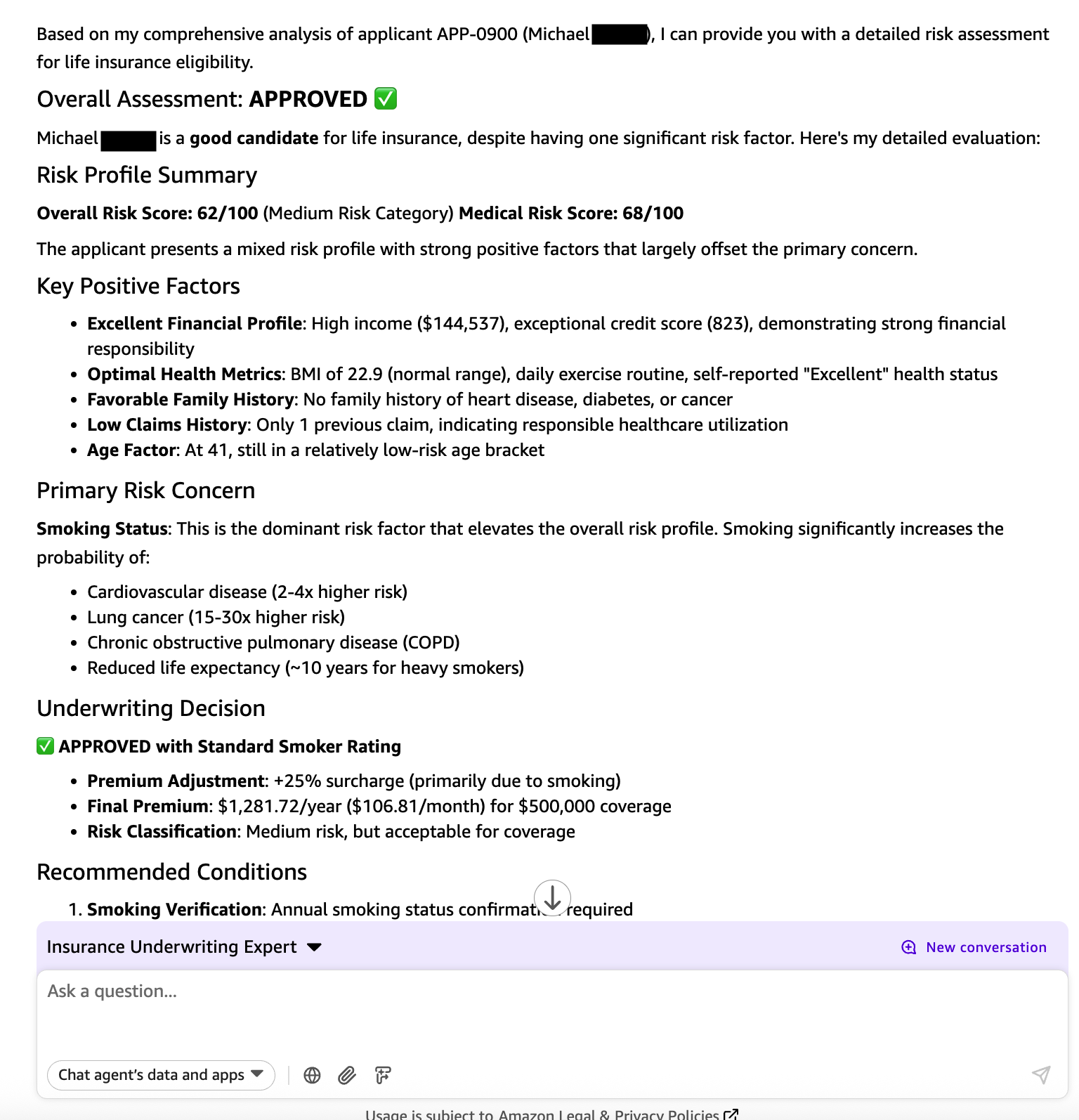 We have concealed personally identifiable information (PII) and other details associated with the applicant for the purposes of this post. However, an authorized user of the application will be able to view the analysis performed by Amazon Nova 2 Lite. You now have a working insurance underwriting agent up and running in less than 30 minutes!