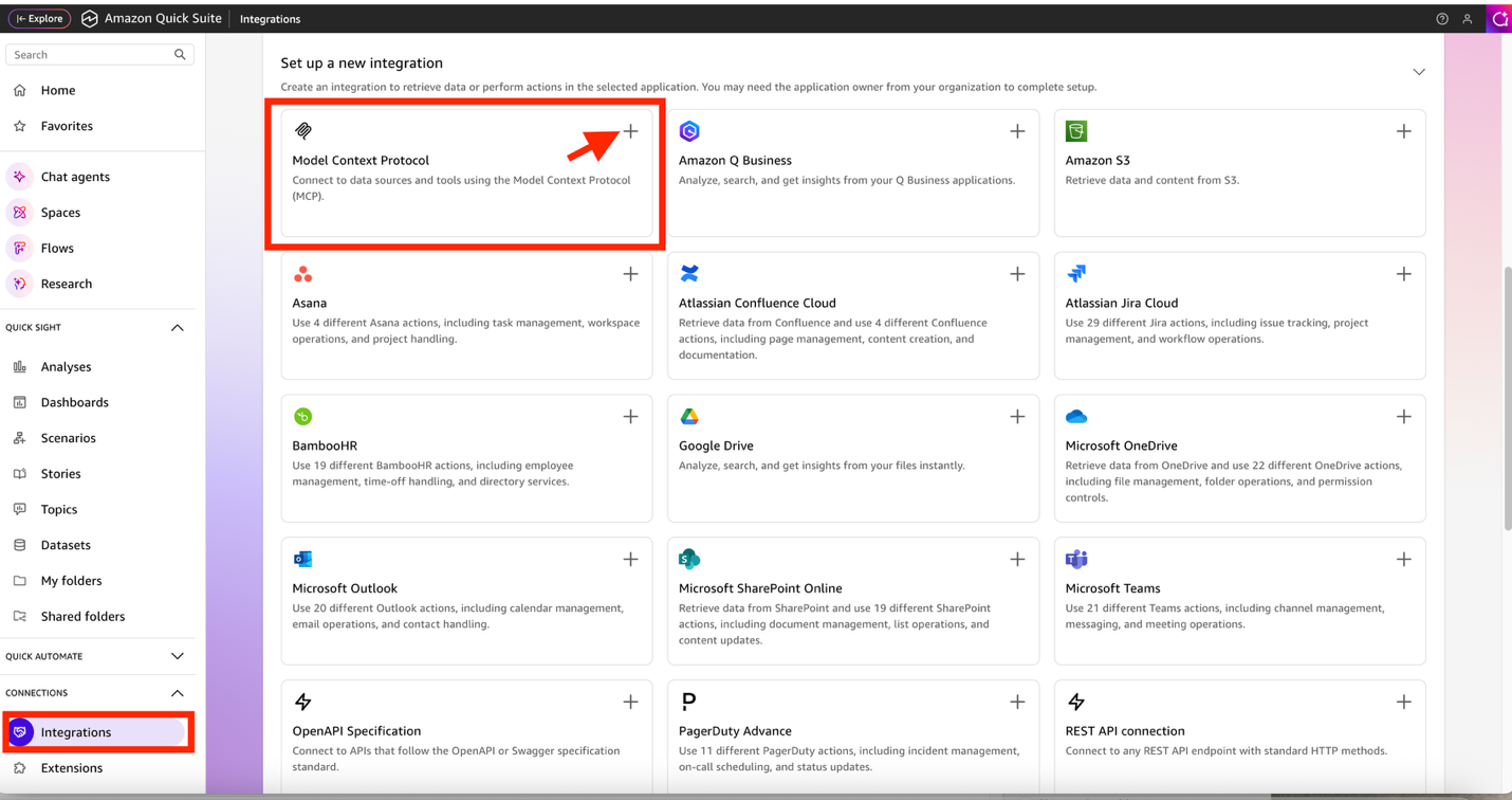 - On the Quick Suite console, choose Integrations in the navigation pane.