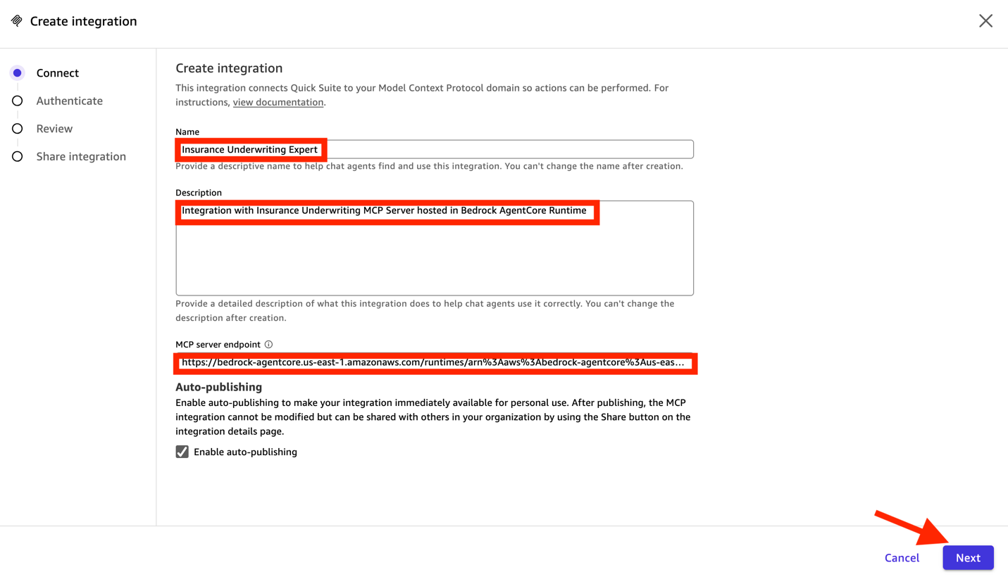 - On the Connect page, enter the integration details of the MCP server you hosted on Amazon Bedrock AgentCore: