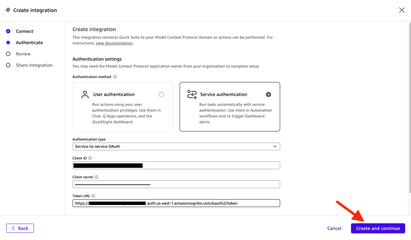 Next, set up a service-to-service OAuth connection from Quick Suite to the Amazon Bedrock AgentCore endpoint. This lets your Quick Suite chat agent call MCP server actions to fulfill user requests.