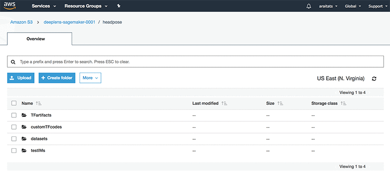 Just like we did in our last blog post, we are first going to create an Amazon S3 bucket using the Amazon S3 console. In this example, we are going to name the S3 bucket “deeplens-sagemaker-0001” hosted in the N. Virginia (US East 1) AWS Region. (If you want to deploy your trained model artifacts straight into AWS DeepLens, the Region must be N. Virginia (US East 1)).